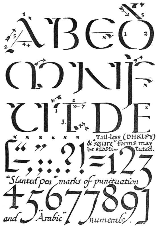 Referring again to good LETTERING: the second part of this book deals with some of its Qualities, Forms—the Roman Capitals & their important pen-derivatives—and Uses. It is written [p-xviii] largely from the penman’s point of view,2 but a chapter on inscriptions in stone has been added and various types and modes of letter making are discussed. The essential qualities of Lettering are legibility, beauty, and character, and these are to be found in numberless inscriptions and writings of the last two thousand years. But since the traditions of the early scribes and printers and carvers have decayed, we have become so used to inferior forms and arrangements that we hardly realize how poor the bulk of modern lettering really is. In the recent “revival” of printing and book decoration, many attempts have been made to design fine alphabets and beautiful books—in a number of cases with notable success. But the study of Palæography and Typography has hitherto been confined to a few specialists, and these attempts to make “” books often shew a vagueness of intention, which weakens their interest and an ignorance of Letter-craft which makes the poorest, ordinary printing seem pleasant by comparison. The development of Letters was a purely natural process in the course of which distinct and characteristic types were evolved and some knowledge of how these came into being will help us in understanding their anatomy and distinguishing good and bad forms. A comparatively little study of old manuscripts and inscriptions will make clear much of the beauty and method of the early work. And we may accustom ourselves to good lettering by carefully studying such examples as we can find, and acquire a practical knowledge [p-xix] of it by copying from them with a pen or chisel or other letter-making tool. A conscientious endeavour to make our lettering readable, and models3 and methods chosen to that end, will keep our work straight: and after all the problem before us is fairly simple—To make good letters and to arrange them well. To make good letters is not necessarily to “design” them—they have been designed long ago—but it is to take the best letters we can find, and to acquire them and make them our own. To arrange letters well requires no great art, but it requires a practical knowledge of letter-forms and of the rational methods of grouping these forms to suit every circumstance.
