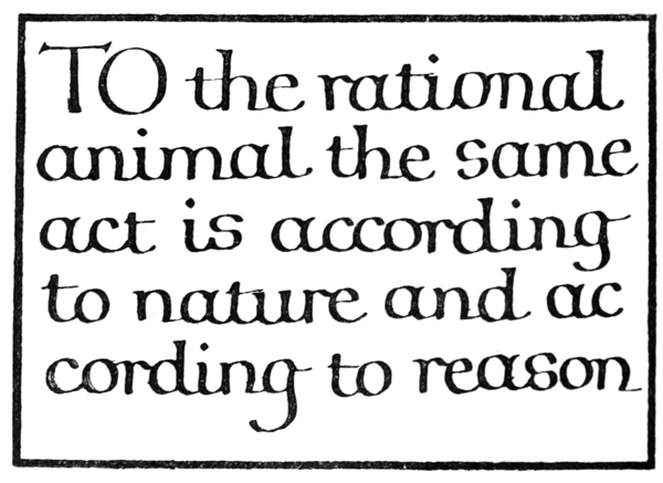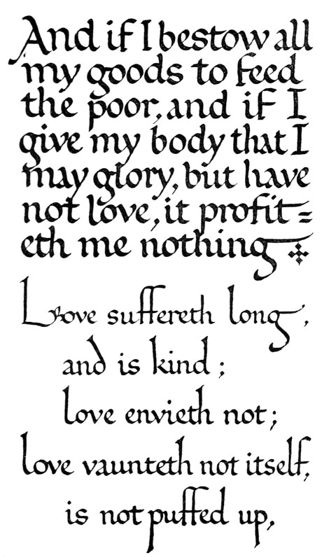 And though calligraphy is a means to many ends, a fine MS. has a beauty of its own that—if two arts may be compared—surpasses that of the finest printing. This in itself would justify the transcribing and preservation of much good literature in this beautiful form (besides the preparation of “Illuminated Addresses,” Service Books, Heraldic and other MSS.) and make the practice of formal writing desirable. And furthermore as the old-fashioned notion that a legible hand is a mark of bad breeding dies out, it may be that our current handwriting will take legibility and beauty from such practice. And even the strict utilitarian could not fail to value the benefits that might some day come to men, if children learnt to appreciate beauty of form in their letters and in their writing the beauty of carefulness.