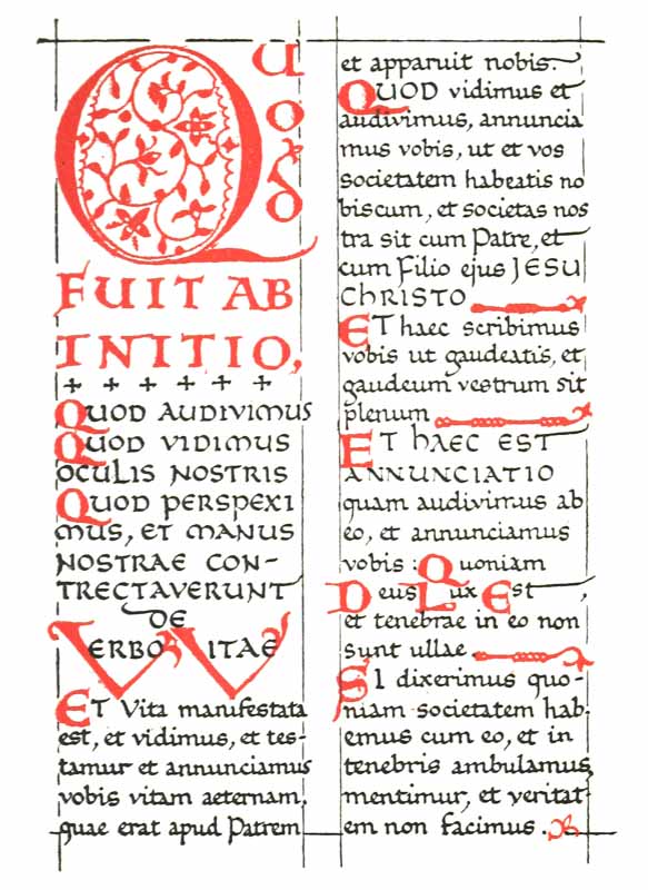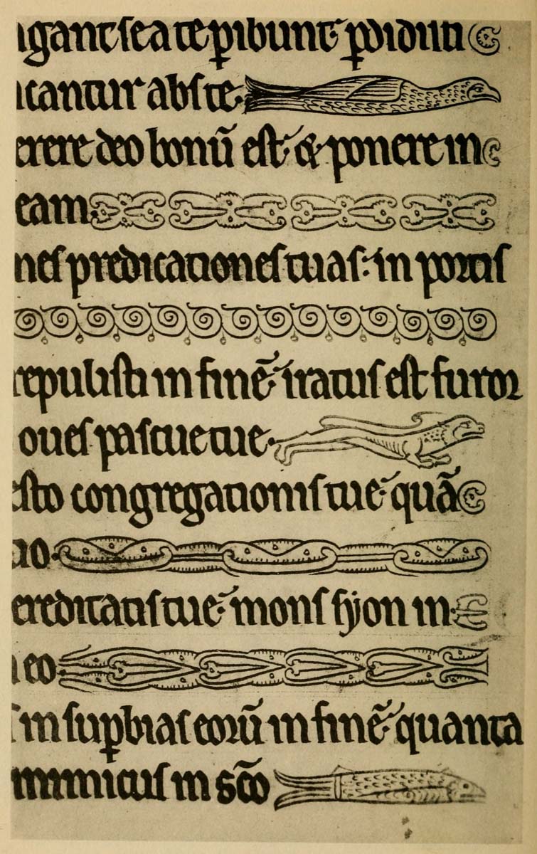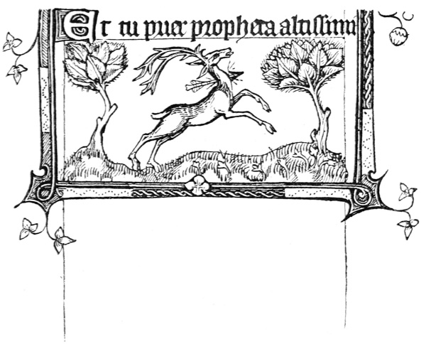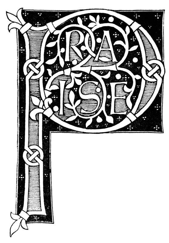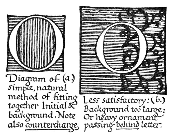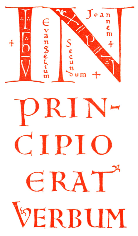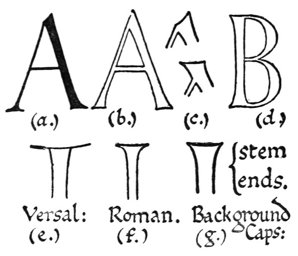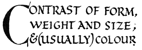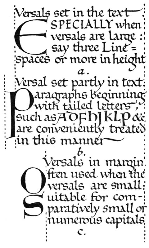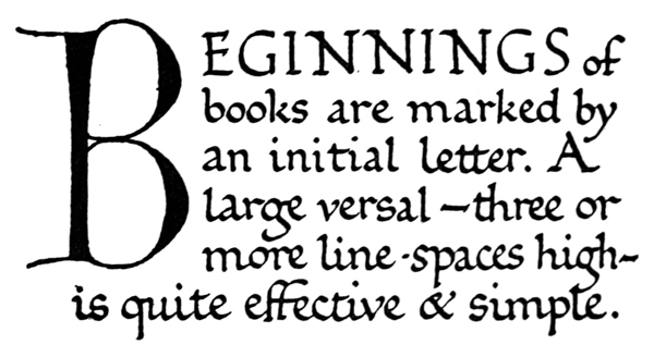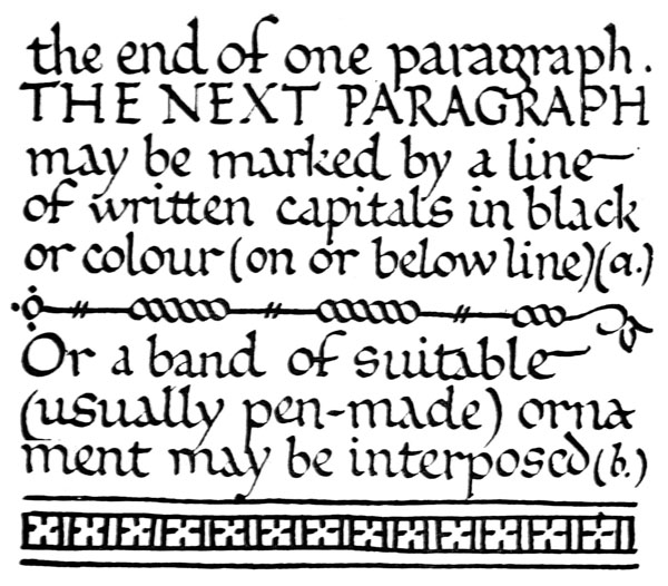 Early illuminated MSS. and printed books with woodcuts (or good facsimiles) may be studied with advantage by the would-be Illuminator, and he should if possible learn to draw from hedgerows and from country gardens. In his practice he should begin as a scribe making MS. books and then decorating them with simple pen & colour work. We may pass most naturally from writing to the decoration of writing, by the making and placing of initial letters. For in seeking first a fine effectiveness we may put readableness before “looks” and, generally, make a text to read smoothly, broken only by its natural division into paragraphs, chapters, and the like. But these divisions, suggesting that a pause in reading is desirable, suggest also that [p-xvii] a mark is required—as in music—indicating the “rest”: this a large capital does most effectively.