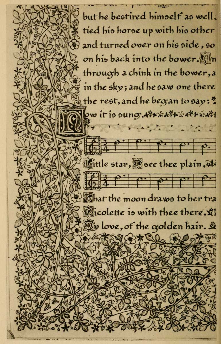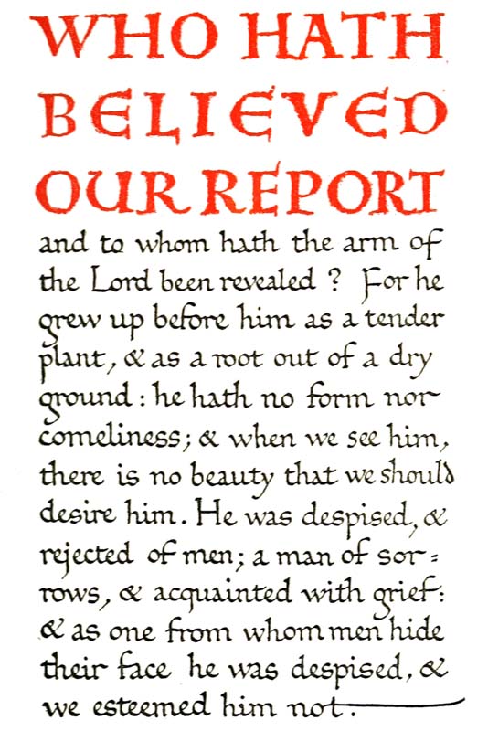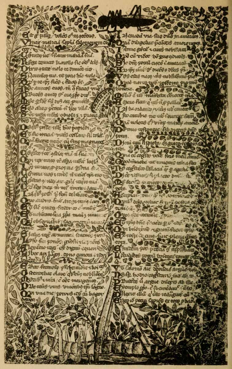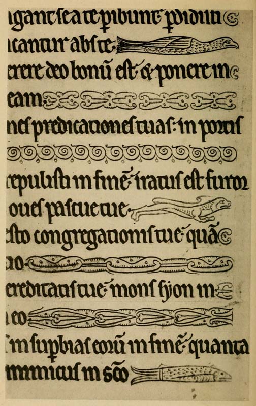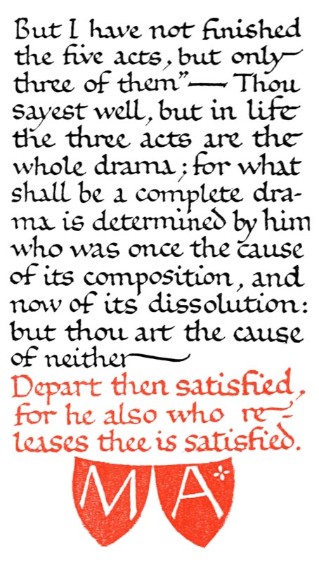 “In the making of the Written Book, . . . . . . the adjustment of letter to letter, of word to word, of picture to text and of text to picture, and of the whole to the subject matter and to the page, admits of great nicety and perfection. The type is fluid, and the letters and words, picture, text, and page are conceived of as one and are all executed by one hand, or by several hands all working together without intermediation on one identical page and [p-xiv] with a view to one identical effect. In the Printed Book this adjustment is more difficult. . . . . . . Yet in the making of the printed book, as in the making of the written book, this adjustment is essential, and should be specially borne in mind, and Calligraphy and immediate decoration by hand and the unity which should be inseparably associated therewith would serve as an admirable discipline to that end.”