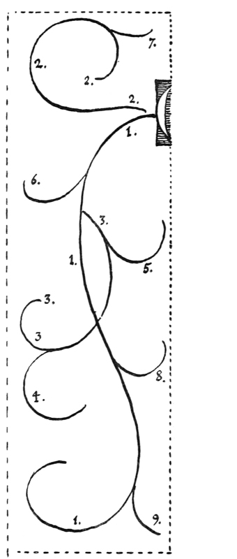 Pp. 219–220. Note: the principle of breaking straight or long lines, mentioned in regard to background edges (p. 190), and illustrated in the line-finishings (fig. 126) and flourishes (fig. 79), is related to branching out and is re-creative, whereas the prolonged line is tiresome (see figs. k, k1, & comp. k2).