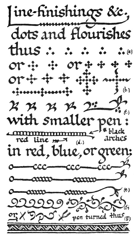 A technical division of illumination into Colour-work, Pen-work, and Draughtsmanship is convenient (see Chap. XI.). Though these are properly combined in practice, it is suggested that, at first, it will be helpful to think of their effects as distinct so that we may attain quite definitely some mastery of pure, bright, colours & simple colour effects, of pen flourishing and ornament, and of drawing—whether plain or coloured, that will go decoratively with writing or printing. This distinction makes it easier to devise definite schemes of illumination that will be within our power to carry out at any stage of our development. And while the penman inevitably gains some power of pen decoration it is well for him as an illuminator to practise in bright colours and gold; for illumination may be as brilliant and splendid in its own way as stained glass, enamels, and jewellery are in theirs.1 At first, at any rate, hues that have the least suspicion of being dull or weak are to be avoided as though they were plainly “muddy” or “washed-out.” The more definite we make our work the more definitely will our materials instruct us; and such service must precede mastery.
