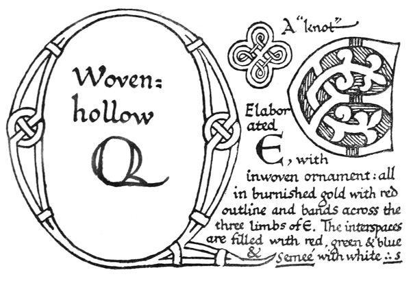 Of the practice of ILLUMINATING—properly associated with writing—it may be observed that, among various ways of acquiring a knowledge of the elements of design & decoration it is one of the most simple and complete. Moreover, a fine illumination or miniature has a beauty of its own that may surpass the finest printed book-decoration. And pictures in books may be as desirable as pictures on the wall—even though like the beautiful household gods of the Japanese they are kept in safe hiding and displayed only now and then. [p-xv]