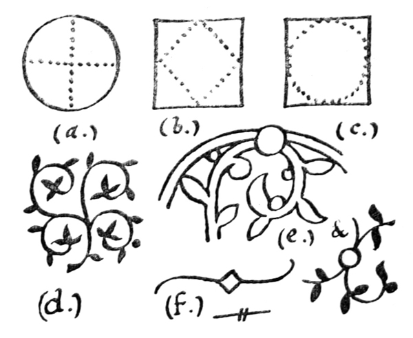 Pp. 215–217. Diapering generally means the variegation, figuring, or flowering, of a plain or patterned surface, with a finer pattern (see fig. 191a). Some diagrams of simple patterns (g–g2 from modern cantagalli ware) are shewn in fig. g. Note: the more solid penwork line-fillings in figs. 87, 126, make effective framing borders (see fig. h).
