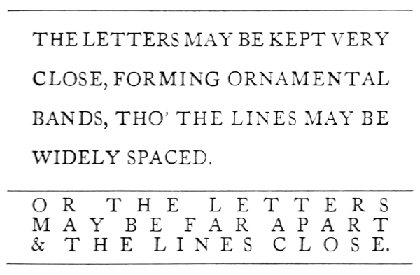 “These have attacked the problem of applied design in one of its simplest and most universal applications, and they have already done a great deal to establish a standard by which we shall be bound to revise all printed and written lettering. If once the principles they have established could gain currency, what a load of ugliness would be lifted from modern civilization! If once the names of streets and houses, and, let us hope, even the announcements of advertisers, were executed in beautifully designed and well-spaced letters, the eye would become so accustomed to good proportion in these simple and obvious things that it would insist on a similar gratification in more complex and difficult matters.”