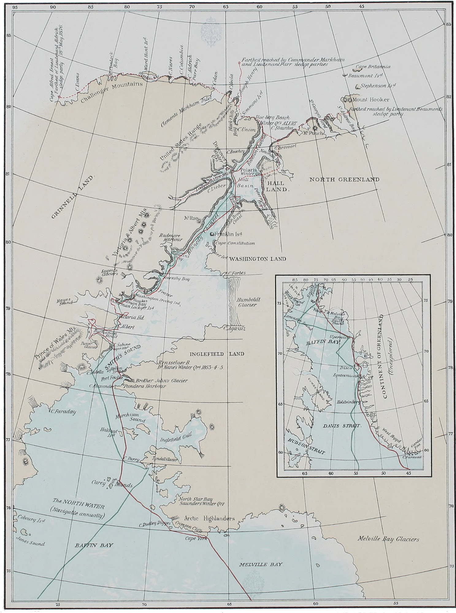 | The Ships Part Company—Robeson Channel—Strange Ice—Lincoln Bay—A Gale—A Rush North—The “Alert” reaches a Latitude never before attained by Ship, and enters a Polar Sea—Precarious Position—Disappointment—No Land to the North—Perennial Ice—Altered Prospects—Autumn Sledging—Pioneering—Dog-sledging—Romance and Reality, | 27 | |