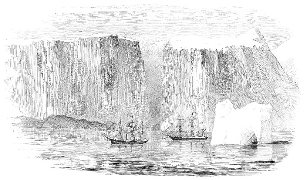 From this point southward to the entrance of Smith’s Sound the return of the Expedition was one monotonous struggle with the ice. Day after day the ships pushed onward between the floes and the shore in whatever openings the changing tide made for them, sheltering behind every projection of the coast. In the far north there are very few, if any, true icebergs, but opposite the Humboldt Glacier we again encountered them, and often found a refuge from the pack amongst groups grounded near shore.