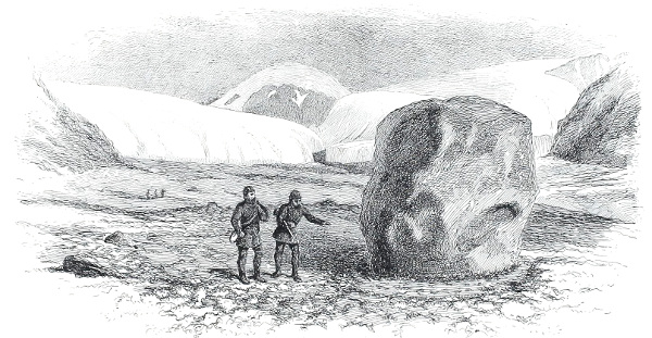 A splendid erratic block of red granite, twelve or fifteen feet high, lay in the south side of the valley, and round it a complete trench was worn deep into the ground by the foot prints of musk oxen as they rubbed themselves against it or stood under it for shelter. This glen was even more fertile than Port Foulke, and would make a delightful winter quarters for an amateur Arctic Expedition. There was plenty of willow, with large well-grown leaves, and in many places the ground was covered with a perfect garden of dwarf flowers; even in the dry parts of the river bed, patches of purple Epilobium covered the sand. We could only account for the absence of game by supposing that the neighbouring valleys were equally rich. An old reindeer antler was picked up, together with the skull of a bear, and at the upper end of the valley some remains of Eskimo “igloos” were discovered, with door posts made of whale ribs.