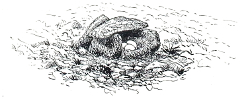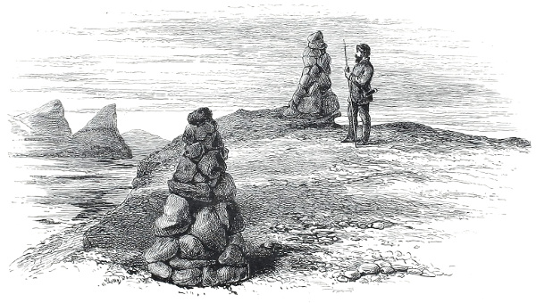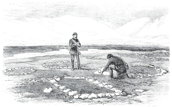 A small ravine intersects the cliff-edge a little eastward from the “Aukrey,” and on the brow over it we came upon two structures, evidently the work of man, puzzling enough at the time, but which we have since learnt to recognise as Eskimo meat caches or safes. Each consisted of a pile of stones covering in a long rectangular chamber, left open at one end, but easily closed by a flat stone which lay close by. Both stood in a conspicuous position on the top of a little rise, and were surrounded by lemming and fox marks. A mile further eastward, the cliffs promised a good commanding position for a view, but the rough and undulating hill-tops took us a good while to get over. At length the ascent of the last ridge was commenced, when suddenly a snow-white object appeared over the brow. It was an Arctic hare, the first we had seen. He was evidently astonished at the reappearance of his old enemy, man, and it was not till after he had made a careful examination of us, standing straight up, full length, on his hind feet, that he concluded we were to be avoided. Then off he went, running ten or fifteen paces erect, then a bound or two on all-fours, then erect again, and finally, when he had run some eighty or one hundred yards, he stopped for another look, sitting on his haunches like a dog begging. This time we were ready for him; he presented a steady mark, and his curiosity was fatal to him. On going to pick him up, we came on a low wall of stones roughly piled, nowhere more than two feet high, leading from the cliff-edge on the right, for about eighty yards inland, to a small shallow tarn; it was apparently some Eskimo hunting contrivance, possibly to assist in driving small game to a suitable spot over the cliffs. Amongst the rounded boulders in the margins of the tarn lay a great number of shed antlers of reindeer, some of them broken and moss-grown, half-buried in the mud; others bleached white, but evidently of no great age. The tips of almost all showed marks of having been gnawed by foxes. Some scattered antlers were found on other parts of the hills, but were always numerous round the tarns; every one we met with had horns of various sizes and ages lying about it.