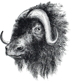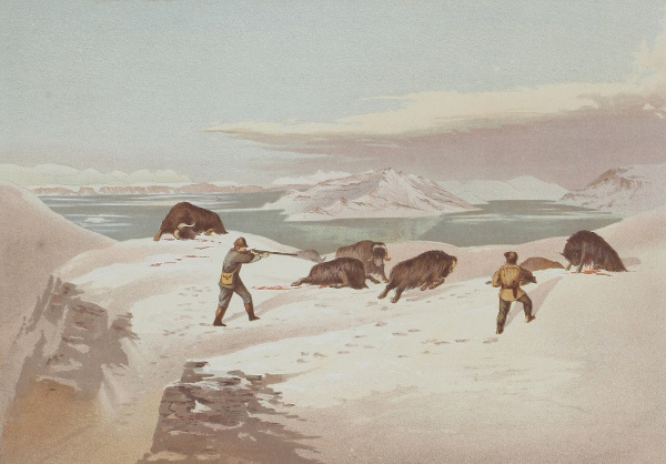 We had not spent many days roaming over our newly uncovered lands, before we began to suspect that tracks of game were, in our part of the Arctic regions at any rate, extremely misleading. On the way northward, whenever the ship came to a standstill amongst the floes, men and officers often made hurried visits to the shore, and invariably came off with the stereotyped [71] report that “traces of game were numerous and recent.” We found so many traces and so little game that the phrase acquired an inverted meaning, and passed into a proverb, but the discrepancy remained unaccounted for. At Floeberg Beach tracks of game were certainly numerous enough. The hard frozen mud at the margins of every pool showed footprints of birds, often so sharp and distinct that “rubbings” with pencil and paper were easily made of them, and sometimes in relief where dust had filled the impression and ice evaporation afterwards lowered the mould. In some places tracks of musk oxen were abundant, and of every size, from the little round footprints of calves to the broad hoof-marks of full-grown animals; but there was absolutely no way of telling when or in what numbers the game had been there. Once frozen, a footprint may last indefinitely, especially if protected by snow; and, for aught we could prove to the contrary, some of the tracks may have been as old as the celebrated mammoth frozen up in the Siberian mud. On 5th July, however, those who contended that the tracks were practically fossil were confounded by the appearance of three musk oxen on a hill-top beyond the north ravine. Their discoverer instantly sent off news to the ship, and, very judiciously, waited patiently till the arrival of assistance rendered their escape impossible. A few mornings afterwards, a fine bull walked innocently down to the beach near the ship, and was forthwith slaughtered. Being a good specimen, and close at hand, he was transferred to the naturalist, and he now represents his species in the British Museum.