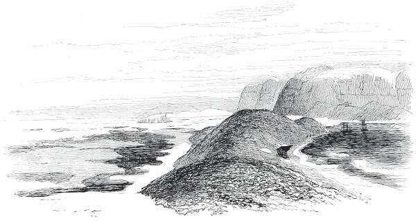 As we pass Cape Constitution, Kane’s furthest, the air, 6° below freezing, warns us that this year’s navigable season is already far gone, but the dazzling sunlight ahead shows but little ice save the film already forming on the sea. Twenty hours’ steam at this rate would take us beyond where ship had ever sailed. But, alas! “open seas” inside the Polar ice are disappointingly limited. Fragments of pack increase in masses, and at length stretch across the channel in a long white line from shore to shore. But a degree and a-half of latitude has been gained, and the 81° parallel lies five miles behind us as the ships are secured between Hannah Island and the grey cliffs of Bessels Bay. The island is merely a number of gravel mounds forming a convex breakwater in the entrance of the narrow fiord. [25] Looking northward from it, Hall’s Basin lay before us, bounded on the right by Cape Morton and Joe Island, and far away beyond the mouth of Petermann Fiord the valley of Hall’s Rest and the distant headlands of “Polaris” Promontory; while to the left, at the other side of the strait, the snowy cliffs of Grant Land formed the western lintel of Robeson Channel. There was little time to explore the island. A sketch which supplies the accompanying engraving was just complete when the signal for recall flew from the foremast of H.M.S. “Alert.” A lead had opened to the north-westward; the whole of the ice was in motion, and that night both ships reached the northern shores of Lady Franklin Straits before the closing pack barred further progress.