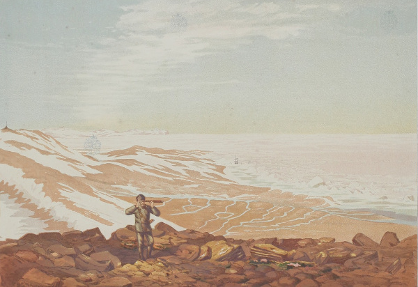 On reaching the summit we were amply rewarded for our expenditure of energy. The prospect was truly magnificent. A thousand feet below, the blue waters of Foulke Fiord lay, rippled with a breeze, under the richly-coloured cliffs of the opposite shore; further on, the flat expanse at the head of the inlet, with Alida Lake, and Brother John’s Glacier of Kane, shaped like a great paw, closed in the valley. Beyond and above all, a broad white plain, the vast inland ice of Greenland, lay spread before us. Even at first sight, this sea of ice could not be mistaken for a frozen sea, for its distant horizon was sensibly above our level.