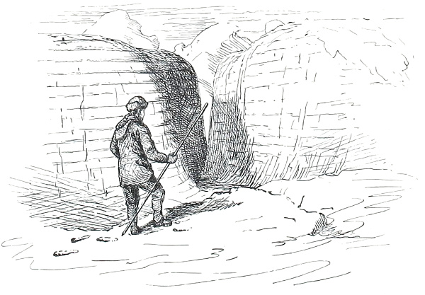 Half-a-mile northward from the depôt, a bank of snow, evidently the accumulation of ages, sloped down from a small hill to the sea. In one place a great slice of the bank had broken bodily from the mass above, leaving a deep crevasse. This was bridged over and completely concealed, except in two places, where the roof had fallen in and exposed its perpendicular walls of green ice streaked with layers of earth and sand. The bank was in fact a miniature “discharging glacier,” the only one yet met with on this coast. A few yards below the openings, the bridge was strong enough to bear the heavily-laden sledges of the western parties. Their course lay through the valley to the left, for though the snow on shore was in many places soft and deep, a short cut across the isthmus promised better travelling than the crush of floes round the cape. The prospects of the northern party were less encouraging. Looking northward from the hill over the crevasse, an icy chaos spread to the horizon. Mirage every now and then raised lines and flakes of distant pack into view, but all as rough and rugged as the ice-floes at our feet.
