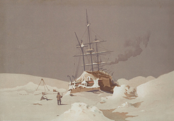 The bay in which we thus found ourselves arrested was afterwards called after Professor Allman. It is an indent in the western coast-line of Kane’s Sea, immediately north of Hayes Sound. It is five miles wide, and at its head we could see a large glacier pouring in two streams round a snow-covered hill, and fronting the bay in a line of icy cliff. Snow lay deep on the mountains on either side, and it still snowed constantly; decks and rigging were covered; a more wintry prospect could hardly be conceived. It was already beginning to grow dark in [82] the evenings, and lamps and candles were again in use between decks. But for a certain disappointment in being checked when we had made up our minds to return, few on board our ships were unwilling to face another winter. Here, two hundred miles further south, it would be a very different affair from the last. Release from the ice next season could be looked forward to as a certainty, and even with a stock of coal lessened by the exigencies of a second winter it would still be possible to escape from Smith’s Sound. If the ships could be got into shelter near the deserted Eskimo hunting-grounds of Norman Lockyer Island, we should probably get plenty of game. Almost all our invalids were again in good health, and when spring came the smooth floes would make the exploration of Hayes’ Sound a pleasure trip. Moreover, if a second winter was unavoidable, there was another reason—a somewhat ignoble one perhaps—why it would not be unwelcome. The advance of pay liberally granted by the Admiralty before sailing was not yet defrayed, and if we reached England this year almost all the men would still be in debt to the Crown, and sailors naturally prefer to land with a little money in their pockets.