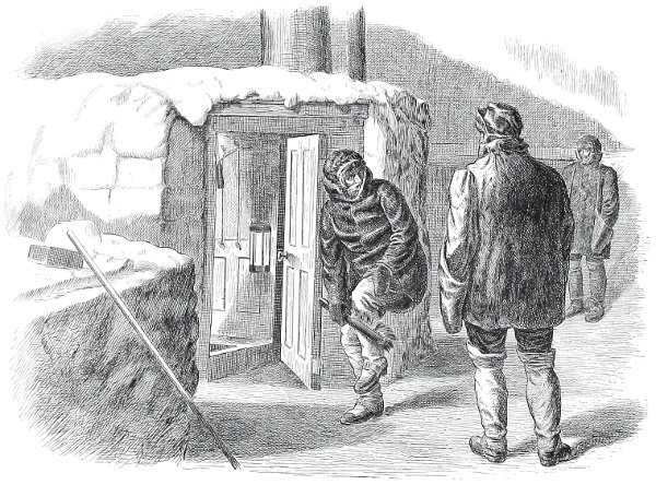 The “Discovery” had passed a winter little, if at all, less severe than ours, but in one respect she had been more fortunate. No less than thirty-three musk oxen were secured in the autumn, and thus a supply of good fresh meat was issued twice a-week during the winter. Her routine and amusements were almost identical with our own, but we heard with surprise of her [63] skating rink, and of dramas performed in a snow-built theatre on shore, where a temperature many degrees below zero obliged the actors to appear muffled to several times the size of ordinary stage heroes.