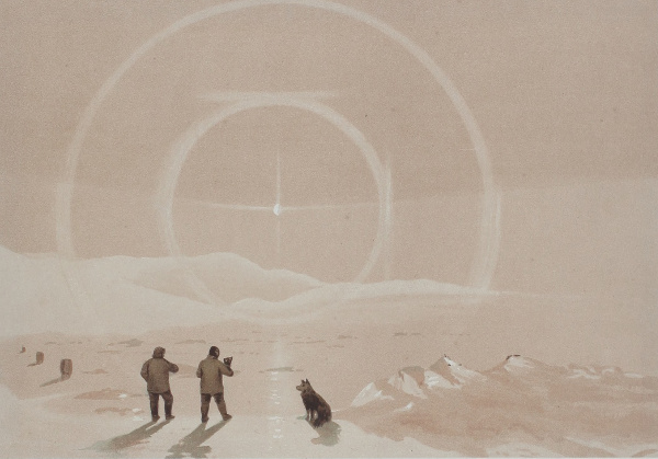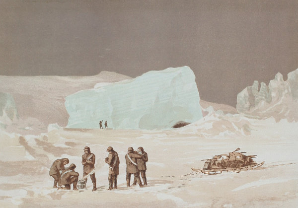 Sunlight amongst the ice is often very beautiful, but at the same time very inconvenient. It had already peeled our faces, now it attacked our eyes. Every crystal of snow reflected a miniature sun, and the path of the rays seemed literally sown with gems, topaz and sapphire generally, but here and there a ruby. Similar colours, but with a curious metallic lustre like oil on water, tinted the fleecy clouds overhead, and the sun itself was almost always surrounded by circles similar to those seen round the moon in winter, but exquisitely rich and brilliant in rainbow-hued colour. No painter could hope to produce the faintest resemblance to such effects. The light was in fact altogether too bright for mortals, and we could only face it with goggles on. The gem-like gleams especially produced a quick pain in the back of the eye that considerably lessened their æsthetic effect. The officers, who have to travel well in advance and climb hummocks to find a road for [61] the sledges, cannot wear goggles continuously; vapour from the eye freezes on the inside of the glass, and it requires the keenest sight to detect differences of level and distance in the white blank of the prospect. On our eighth day’s journey a faint mist took away all shadow from the ice, and though a man might be seen several hundred yards off, it was quite impossible to tell whether the next step was up or down, into a hole, or against a hummock. That day, pioneering was done rather by touch than sight. When the fog lifted, we found ourselves close to Cape Joseph Henry, and next forenoon the depôt left there in the autumn was transferred to the advancing sledges.