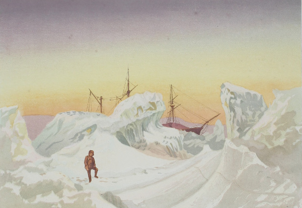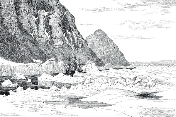 Our progress southward was a race against rapidly approaching winter. Snow fell in large quantities, and lay in thick paste on the water in cracks and pools. One by one the headlands passed on our northward voyage were rounded, and day by day new ice grew thicker and our stock of fuel dwindled. There several attempts were made to force a way past Cape Hawkes, and when we did succeed, the bay beyond was found full of new ice, so thick that the whole power of our engines could not push through. It cracked here and there before the ships, but soon brought both to a standstill, and the order was given to put out the fires.