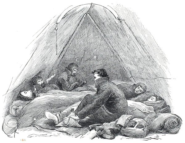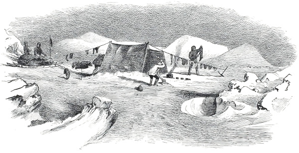 We camped early on the first day’s march. The spot selected was a little bay inside one of the curious hook-shaped promontories of the coast. The process of camping is a simple one. When camping-time comes, an officer goes on in advance and selects a flat piece of snow—a spot where it is soft for about six inches down is best. Then the sledge halts. Everything is unpacked. The cook of the day lights up his stearine lamp under a panful of snow for tea. The tent, with its poles already secured in it, is pitched, with its door away from the wind, and secured by ropes to the sledge at one end, and to a pickaxe driven into the snow or ice at the other; then a waterproof is spread over the snow inside, and over it a robe of duffle, a material like close blanket. The sleeping-bags and haversacks are next passed in, and the men, beginning with the innermost—for there is not room for all at once—change their snow-saturated moccasins and blanket wrappers for night pairs carried in the haversack. Moccasin, worsted stockings, and blanket wrappers all pull off together, frozen hard into one snowy mass about the foot. Meantime others are “banking up” snow all round the tent outside. Nothing adds more to the warmth of the tent than thorough “banking up.” In about an hour from the time of halting, every one, except the cook, is packed inside his bag. All wear close-fitting Berlin wool helmets, enclosing head and neck, and leaving only the face exposed; the men call them “Eugénies,” for they were the thoughtful gift of the Empress. The cook soon gives notice that tea is ready, and each man sits up in his bag and gets his pannikinful, softening his biscuit in it as it cools to a drinkable temperature. After tea comes half-a-pound of pemmican—a peppery mixture when one’s lips are blistered with hot and cold pannikins, and cracked with sun and frost. An ounce of preserved potato is warmed up with it, and greatly improves its flavour. When the cook has trimmed his lamp for the morning, and scraped out the pannikins, his duties are over, and he changes his foot coverings, wriggles into his bag, and squeezes himself down next the door. Finally, about half a wine-glassful of rum with a little water is served out all round. This, however injurious under other circumstances, helps to tide over the chilly moments when one’s frozen clothes melt, and acts much as a bellows does to a feeble fire. The heads soon disappear into the bags, and everyone goes to sleep as fast as the cold and cramp in his feet and legs will let him.