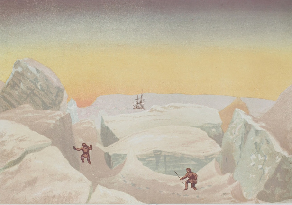 The Expedition left Disco on 15th July, and steamed northward between the island and the mainland. Then, making a short halt at Rittenbenk, it stood down the Waigat. At a distance it seemed as if the whole strait was blocked with icebergs; we, however, found broad leads of water between them, smooth as a mirror, but for an occasional swell, as some great fragment slipped into the sea with a roar like a distant park of artillery. There, with the most earnest wishes for our success, our friends [12] of the “Valorous” bade us adieu. An hour afterwards we found ourselves cruising about amongst the bergs in a thick fog. Every now and then a white mass would be seen gleaming ahead; down would go the helm just in time to avoid collision, and the sound of the sea in the azure hollows along its sides would scarcely be gone when the helm was again hard over to clear another.