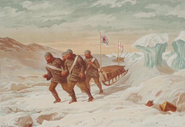 The arrival of the dog-sledge was a signal for the immediate departure of the “Discovery’s” sledging parties. A dog-sledge was despatched south-eastward to “Hall’s Rest” to ascertain how far the stores left by U.S.S. “Polaris” could be utilised. Then two eight-men sledges, the “Sir Edward Parry” and the “Stephenson,” under Lieutenant Beaumont and Dr. Coppinger, started for the north coast of Greenland, calling at Floeberg Beach on their way, and being there joined by Lieutenant Rawson’s sledge, the “Discovery.” They left the “Alert” on 20th April, and two smaller sledges helped them across Robeson Channel, and then left them to follow the rugged coast that we could see stretching far eastward to Cape Britannia. Another division of sledges, with Lieutenant Archer and Sub-Lieutenant Conybeare, pushed northward through Lady Franklin Sound, hoping to find it opening northward like Robeson Channel, and perhaps affording a smooth and direct route to the shores of the Polar Sea for next year’s parties.