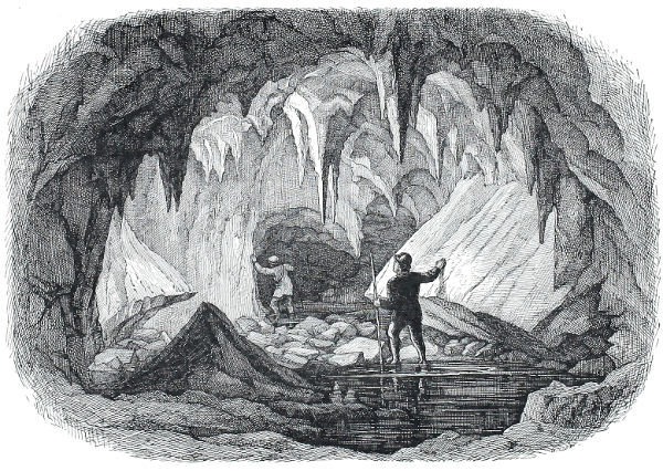 Striking inland, we passed through a number of valleys with steep rocky walls and a flat floor between, like railway-cuttings on a large scale, and at length reached a little stream winding eastward towards the channel. Following it down a short distance, we found it entering a gorge, with mountains a thousand feet high on either side. Soon the only way to advance was by [79] wading amongst the boulders in the bed of the stream, with overhanging walls of black rock on either side, so close that we could almost touch both with outspread hands. No wonder the “Discovery’s” autumn sledge-crews had found this a rough road. Finally, the ravine ended in a very unexpected manner. A vast bank of snow and ice sloped across from mountain to mountain, and the stream disappeared under it and into an icy cave. We followed the stream, and found ourselves in Chatel’s Grotto, so called after a blue-jacket in the autumn sledge-party that had pronounced it a most comfortable camping-place. The roof was of white ice, streaked with veins of sand, and groined into all sorts of fantastic shapes. An opening overhead let in some rays of light through festoons of icicles as thick as a man’s body. On either side curious sloping shelves of ice projected out over the stream. It was decidedly a picturesque spot, and if the water in which we stood had not been so intensely cold, we might have taken longer time over our sketch. Here we were close to the coal-seam, but the worst part of the road was yet to come. The stream passed out of the far end of the grotto through a dark tunnel, so low that we had to stoop to avoid knocking our heads against the ice of the roof, and so dark that we were obliged to feel our way along by the sides, stumbling and floundering amongst the pools and boulders. Presently, however, light shone through at the other end, and we emerged into a continuation of the gorge. A bend of the stream brought us to the spot we sought. Right and left rose two great mountain slopes, with the rivulet running between them. The lower twenty or thirty feet of the right bank was a perpendicular wall of coal, streaked with yellow [80] sulphurous lines. The surface had become brittle by exposure to the weather, but a few blows of a pick revealed a depth of shining black fuel, to all appearance as good as any we had on board.