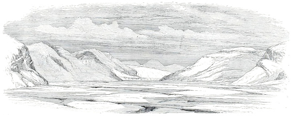 The coast of Greenland, like other western shores, is so subdivided by inlets and fiords, that there are but few places where it is possible to get a good view over any extent of the mar de glace. Three or four miles off, as we saw it, its surface seems smooth enough, but it is really so uneven and fissured, that the most persevering attempts to travel inland over it have penetrated but a short distance, after three days’ incessant toil. When not checked by labyrinths of crevasses, the travellers have encountered impassable rivers, flowing in icy beds, till they plunged in a cloud of mist into fathomless pits. Enough, however, has been learned to justify the belief, that a continuous mass of ice, many thousand feet deep, loads the whole of Greenland, from the land’s end near Cape Farewell, to far north beyond Petermann’s fiord, where our Expedition traced its outline behind the coast hills on the shores of the Polar Sea.