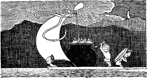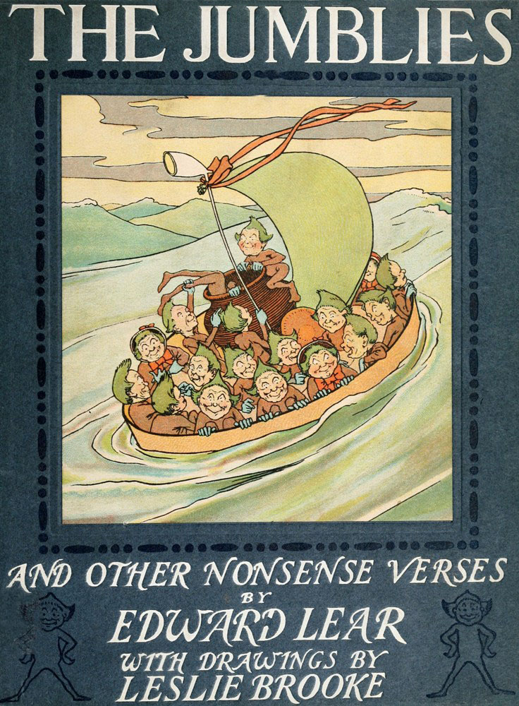 | And all night long they sailed away; And when the sun went down, They whistled and warbled a moony song To the echoing sound of a coppery gong, In the shade of the mountains brown. “O Timballo! How happy we are, When we live in a Sieve and a crockery-jar, And all night long in the moonlight pale, We sail away with a pea-green sail, In the shade of the mountains brown!” Far and few, far and few, Are the lands where the Jumblies live; Their heads are green, and their hands are blue, And they went to sea in a Sieve. |
