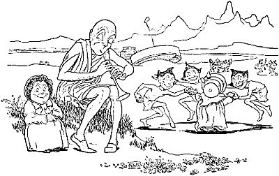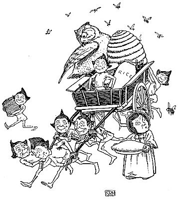 | Mrs. Broom and Miss Shovel together they sang, “What nonsense you’re singing to-day!” Said the Shovel, “I’ll certainly hit you a bang!” Said the Broom, “And I’ll sweep you away!” So the Coachman drove homeward as fast as he could, Perceiving their anger with pain; But they put on the kettle, and little by little They all became happy again. Ding-a-dong! Ding-a-dong! There’s an end of my song! |
