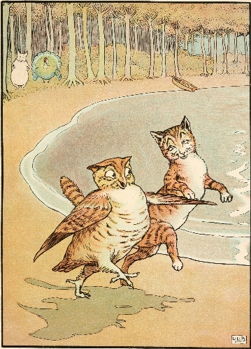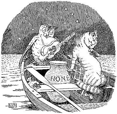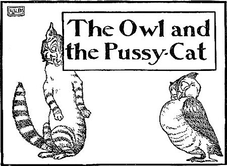| The Owl and the Pussy-Cat went to sea In a beautiful pea-green boat, They took some honey, and plenty of money, Wrapped up in a five-pound note. The Owl looked up to the stars above, And sang to a small guitar, “O lovely Pussy! O Pussy, my love, What a beautiful Pussy you are, You are, You are! What a beautiful Pussy you are!” |