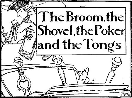 | The Broom and the Shovel, the Poker and Tongs, They all took a drive in the Park, And they each sang a song, Ding-a-dong! Ding-a-dong! Before they went back in the dark. Mr. Poker he sat quite upright in the coach, Mr. Tongs made a clatter and clash, Miss Shovel was dressed all in black (with a brooch), Mrs. Broom was in blue (with a sash). Ding-a-dong! Ding-a-dong! And they all sang a song! |