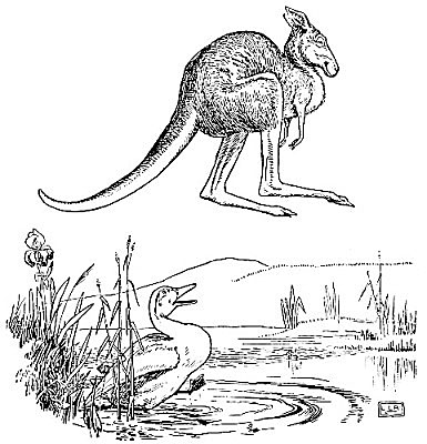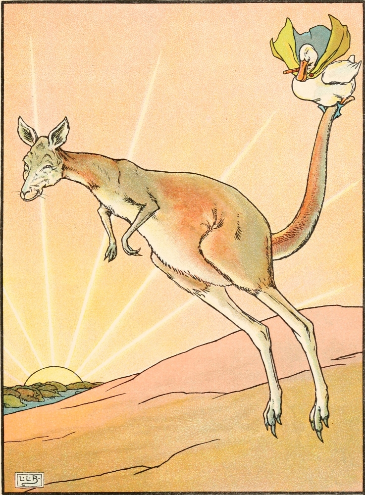 | Said the Kangaroo, “I’m ready! All in the moonlight pale; But to balance me well, dear Duck, sit steady! And quite at the end of my tail!” So away they went with a hop and a bound, And they hopped the whole world three times round; And who so happy,—O who, As the Duck and the Kangaroo? |