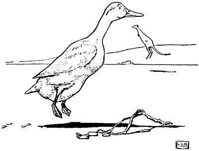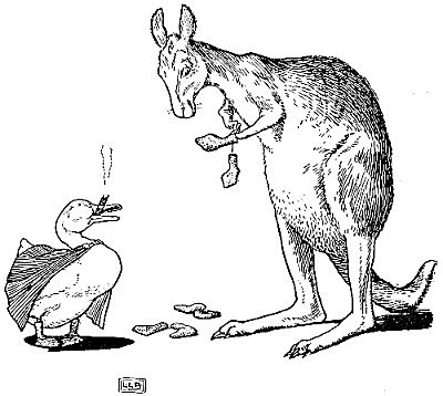 | Said the Duck, “As I sat on the rocks, I have thought over that completely, And I bought four pairs of worsted socks Which fit my web-feet neatly. And to keep out the cold I’ve bought a cloak, And every day a cigar I’ll smoke, All to follow my own dear true Love of a Kangaroo!” |