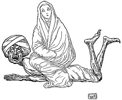 | She sat upon her Dobie,— She heard the Nimmak[12] hum,— When all at once a cry arose: “The Cummerbund[13] is come!” In vain she fled;—with open jaws The angry monster followed, And so (before assistance came), That Lady Fair was swallowed. |