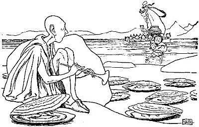 | Below her home the river rolled With soft meloobious sound, Where golden-finned Chuprassies[6] swam, In myriads circling round. Above, on tallest trees remote, Green Ayahs perched alone, And all night long the Mussak[7] moaned Its melancholy tone. |