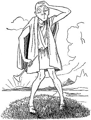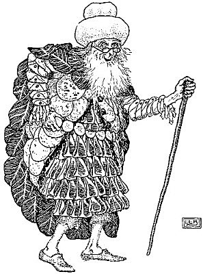 | There lived an old man in the Kingdom of Tess, Who invented a purely original dress; And when it was perfectly made and complete, He opened the door, and walked into the street. By way of a hat he’d a loaf of Brown Bread, In the middle of which he inserted his head;— His Shirt was made up of no end of dead Mice, The warmth of whose skins was quite fluffy and nice;— His Drawers were of Rabbit-skins;—so were his Shoes;— His Stockings were skins,—but it is not known whose;— His Waistcoat and Trowsers were made of Pork Chops;— His Buttons were Jujubes and Chocolate Drops;— His Coat was all Pancakes, with Jam for a border, And a girdle of Biscuits to keep it in order; And he wore over all, as a screen from bad weather, A Cloak of green Cabbage-leaves stitched all together. |