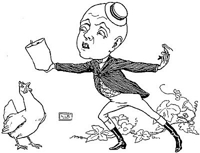 | He had walked a short way, when he heard a great noise, Of all sorts of Beasticles, Birdlings, and Boys;— And from every long street and dark lane in the town Beasts, Birdles, and Boys in a tumult rushed down. Two Cows and a Calf ate his Cabbage leaf Cloak;— Four Apes seized his Girdle, which vanished like smoke;— Three Kids ate up half of his Pancaky Coat,— And the tails were devoured by an ancient He Goat;— An army of Dogs in a twinkling tore up his Pork Waistcoat and Trowsers to give to their Puppies;— And while they were growling, and mumbling the Chops, Ten Boys prigged the Jujubes and Chocolate Drops. He tried to run back to his house, but in vain, For scores of fat Pigs came again and again;— They rushed out of stables and hovels and doors,— They tore off his Stockings, his Shoes, and his Drawers. And now from the housetops with screechings descend, Striped, spotted, white, black, and grey Cats without end; They jumped on his shoulders and knocked off his Hat,— When Crows, Ducks and Hens made a mincemeat of that:— They speedily flew at his sleeves in a trice, And utterly tore up his Shirt of dead Mice;— They swallowed the last of his Shirt with a squall,— Whereon he ran home with no clothes on at all. And he said to himself as he bolted the door, “I will not wear a similar dress any more, “Any more, any more, any more, never more!” |