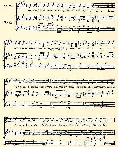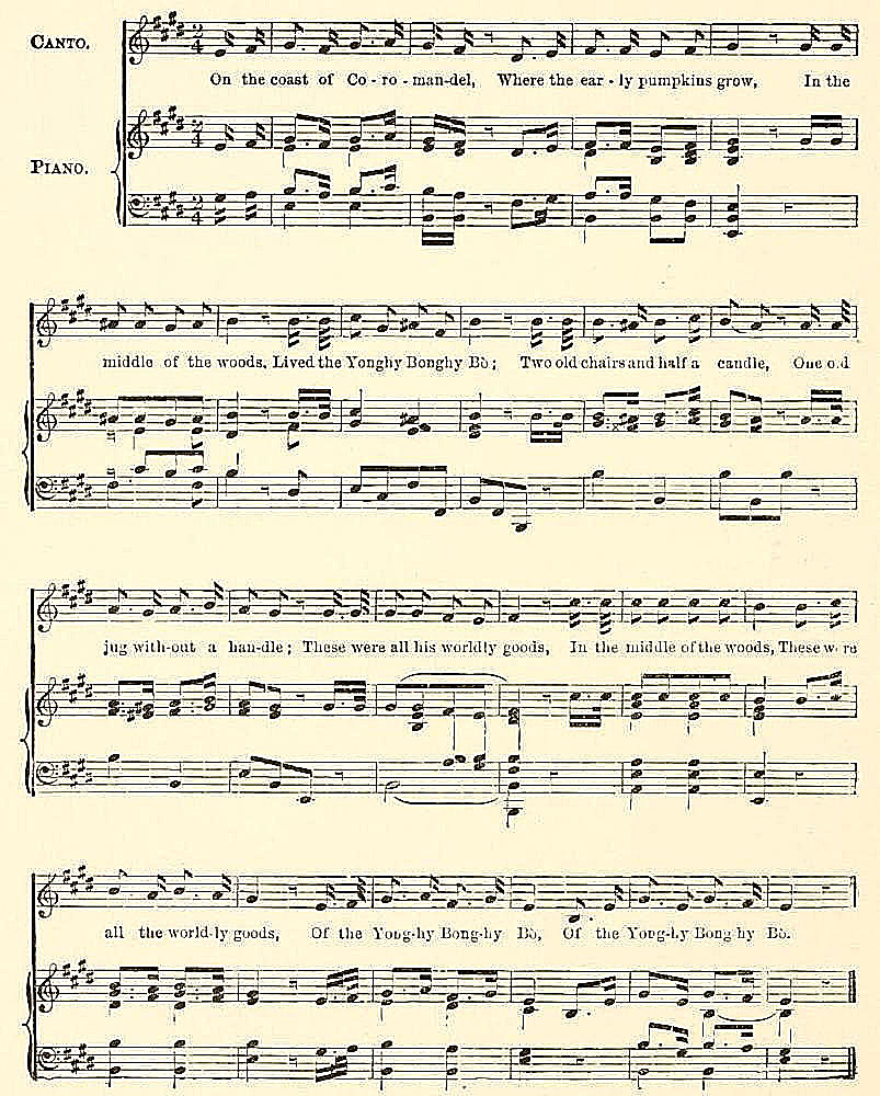| On the Coast of Coromandel, Where the early pumpkins grow, In the middle of the woods Lived the Yonghy-Bonghy-Bò. Two old chairs, and half a candle,— One old jug without a handle,— These were all his worldly goods: In the middle of the woods, These were all the worldly goods Of the Yonghy-Bonghy-Bò, Of the Yonghy-Bonghy-Bò. |