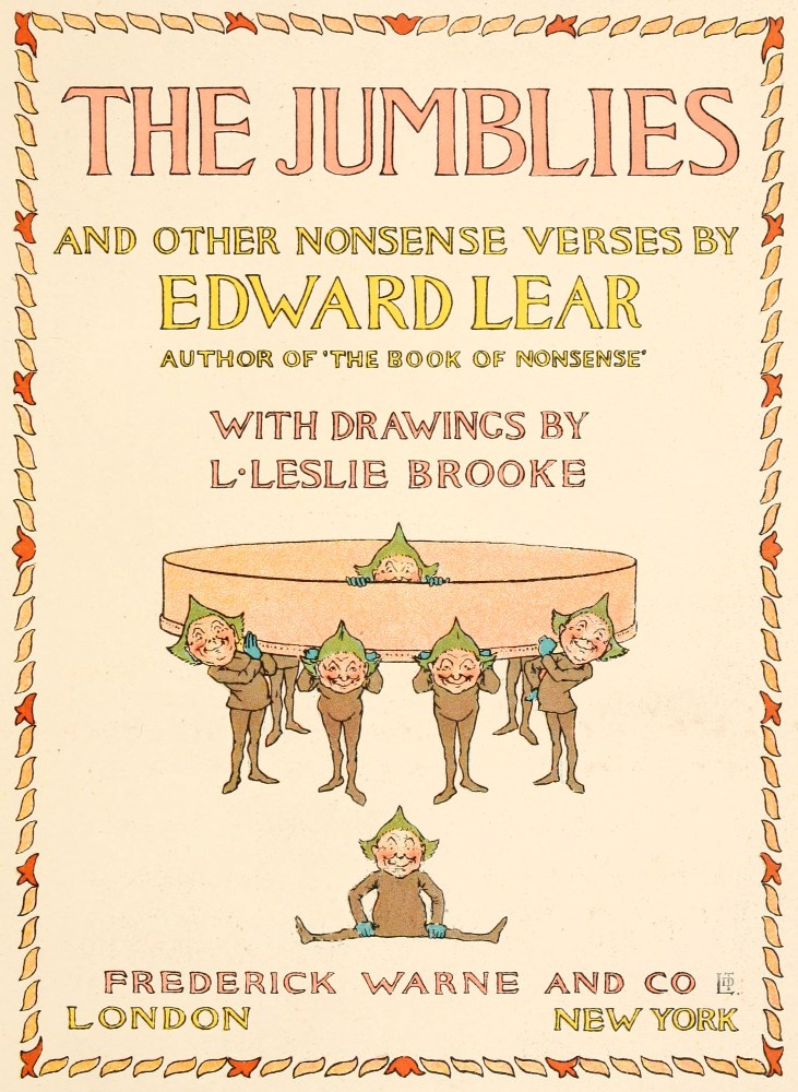 Encouraged by the cordial reception extended by Press and Public to their issue of the “Pelican Chorus and Other Nonsense Verses by Edward Lear,” newly illustrated, the Publishers have requested the Artist, Mr. L. Leslie Brooke, to do a similar service for a further selection from Lear’s Nonsense Songs, thus practically completing them. In addition to “The Jumblies,” which has been adopted as the titular piece, this volume includes such prime favourites as “The Owl and the Pussy Cat,” “The Duck and the Kangaroo,” and “The Dong with a Luminous Nose.” For the benefit of those whose memories of the Nonsense Songs are not as fresh as they should be, it may be repeated that Mr. Lear did not illustrate them as fully as was his custom; some, indeed, had no drawings at all, and others merely a headpiece. The Publishers feel, therefore, that in re-issuing the songs adequately illustrated, they are but bringing them into line with Mr. Lear’s other works.