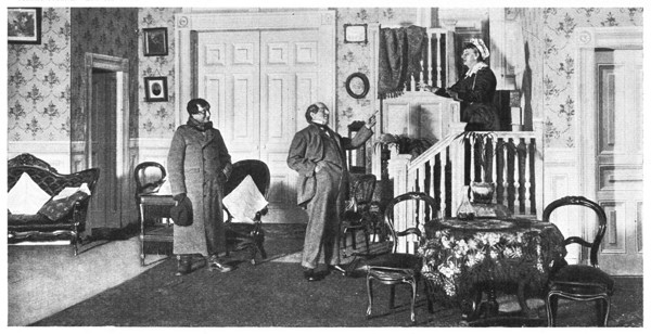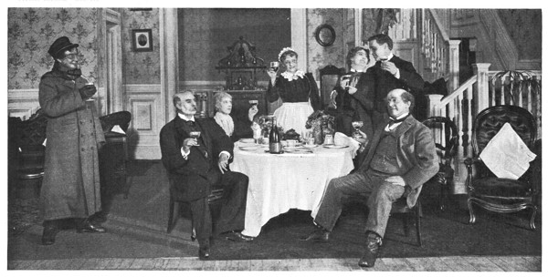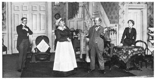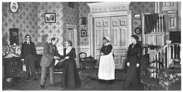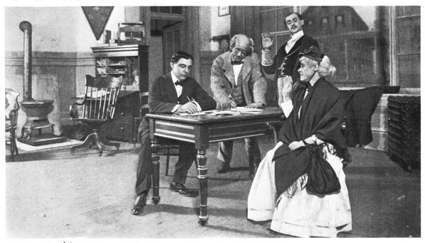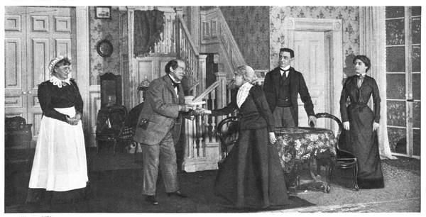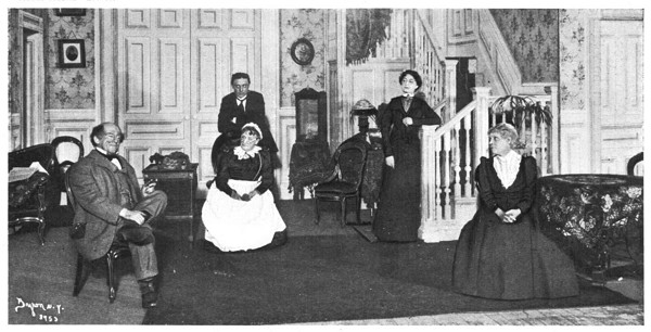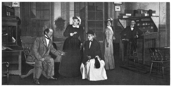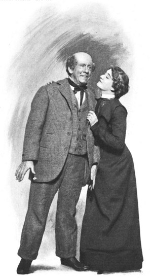 The difference between the written and the acted tale is illustrated in the use made of the Christmas story in the play. In the book David tells John Lenox the story of the Widow Cullom and her dealings with 'Zeke Swinney, and reveals the truth to her in his office, and the dinner which follows at his house is prolonged by his inimitable tales. In the play action takes the place of description. In the first act we see 'Zeke Swinney obtaining blood-money from the widow, and the latter makes the acquaintance of Mary Blake, newly entered upon her career of independence as Cordelia Prendergast. In the second act we see the widow giving the second mortgage to David, and thereby strengthening Mary Blake's suspicions, and in the third act David pictures his dreary youth and Billy P.'s act of kindness, and brings the widow to her own, the climax coming with the toast which opens the dinner and closes the play. It was a delicate and difficult task for even so distinguished an actor as Mr. Crane to undertake a part already hedged about by conflicting theories; but his insight and his devotion to the character have succeeded in actually placing before us the David Harum created by Mr. Westcott.