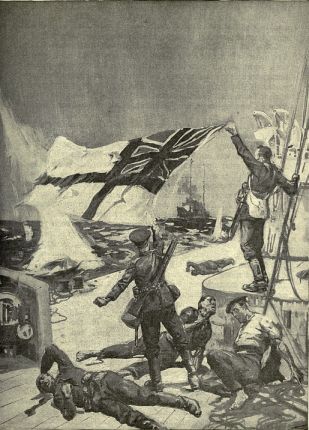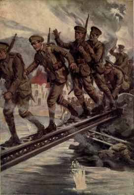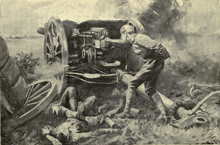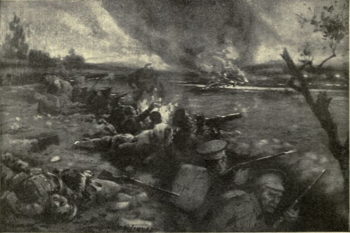 Against these terrible odds our men fought stubbornly. Again and again the dense masses of the Germans pressed towards them, and as they did so a sheet of flame flickered along the line of British trenches, and they were beaten down like a field of standing wheat before a hailstorm. But no sooner were they swept to earth than their supports appeared, only to [31] meet the same fate. Our men grew sick with slaughter. In some places the crowded ranks of the enemy managed to come close to the British trenches. Then our men leaped forward with a cheer and drove with the bayonet through and through the ranks, until the survivors turned and fled, followed by the pitiless fire of Maxims and field guns.