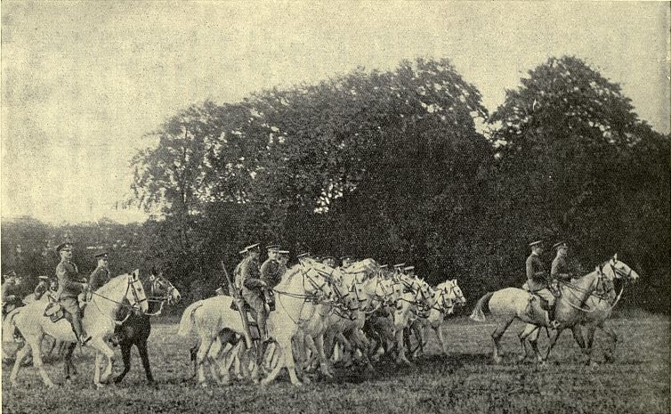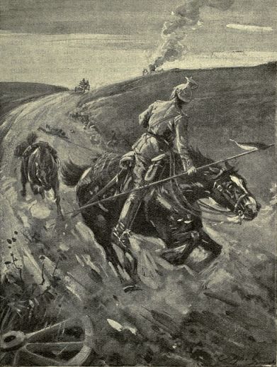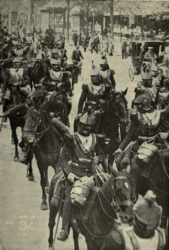 French cavalry have always been famous, and it is said that they were [7] never better than in 1914. The riding was good and the horses were excellent. What are known as the Chasseurs d'Afrique are perhaps the best of all French horse soldiers. At Sedan their furious charges almost turned the fortunes of that black day. The Cuirassiers[4] wear a brass helmet, from which a tail of horsehair hangs down the back. The helmet is covered with gray cloth in time of war.