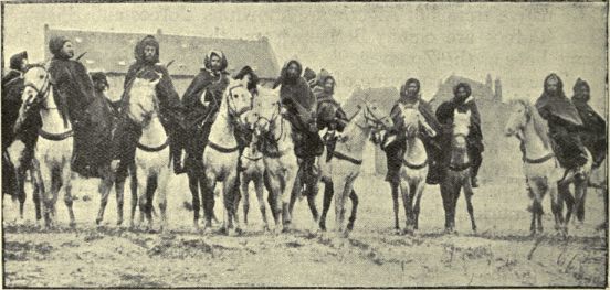 The Spahi is as much at home on horseback as the cowboy of the prairies, the Cossack of the steppes, or the Hungarian of the plains. As a light horseman he has few superiors. Each man wears on his head a white felt cap covered by a haick, or long strip of woollen gauze which hangs flat at the back of the head, covering the neck and shoulders. The haick is attached to the cap by twenty or thirty twisted coils of camel's-hair rope, and a fringe of it is allowed to fall on the forehead to shade the eyes. The body garment, or gandoura, is a gown of white woollen material, bound round the waist with a broad silk sash. Over all is worn a hooded cloak, or burnous, which is usually made of white or fine blue cloth. Red leather top-boots complete the costume. Many of the men are very tall and of a strikingly noble cast of feature. They carry themselves with great dignity, and are very grave and sparing of speech. Their love for their horses has been the subject of many a song and story.