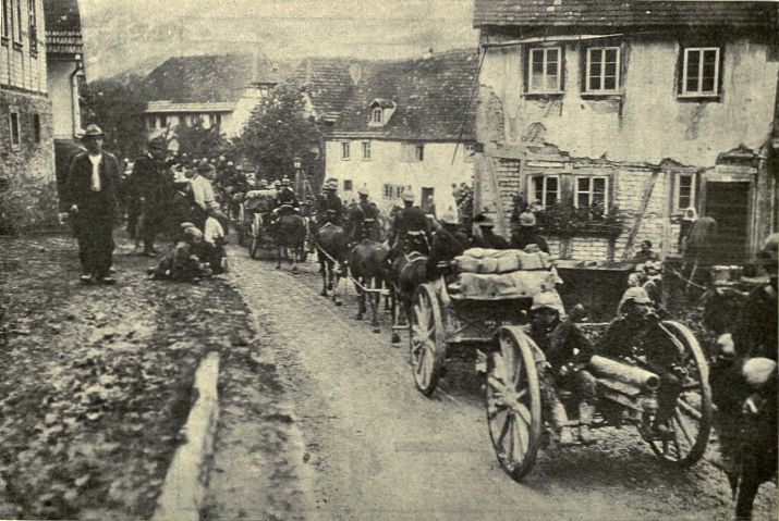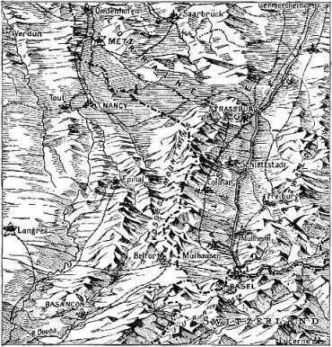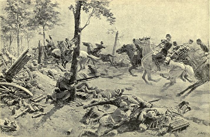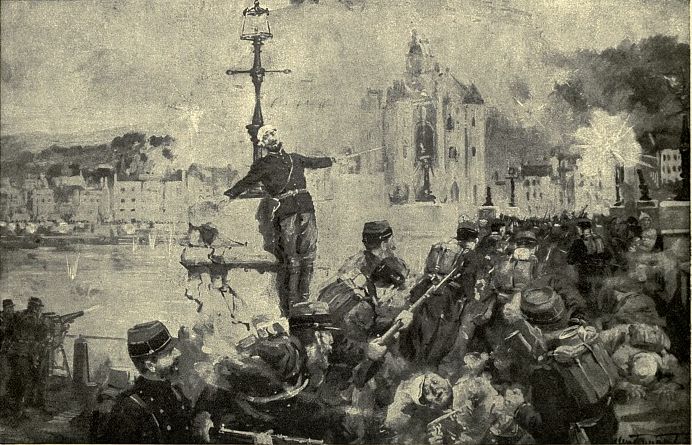 About two in the afternoon, in the very nick of time, French reinforcements arrived. A French infantry regiment appeared on the left bank of the river, and drove the cavalry out of the suburbs. Meanwhile two French batteries took up position, and began a brisk cannonade of the citadel. One of their first shots cut the German flag in two. So hot was the fire that the enemy was forced to leave the citadel and retire along the cliffs to the south. A vigorous artillery duel was kept up across the valley; the French dashed across the river by the bridge, [14] retook the town, and flung back the Germans, who retreated east and then south. Thus in the first battle of the war the French were victorious.