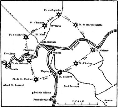 Now we must visit another town of Belgium—the famous fortress of Namur, which stands on a hill in the sharp angle between the Meuse and the Sambre. Southward and eastward of it lies the trench valley of the Meuse; to the west extends the vale of the Sambre, which runs through the "Black Country" of Belgium. Standing at the meeting-point of these rivers, Namur bars the road into France, and it has been fortified from very early times. Brialmont, of whom you have already heard, built a ring of four large forts and five smaller forts round it, and about three hundred and fifty guns were mounted in them. From this little map you will see how they were placed. As most of them were on high ground, it was hoped that they would hold out for a long time.