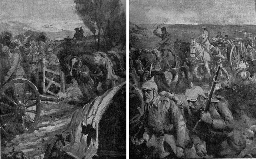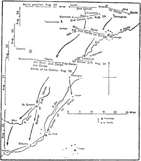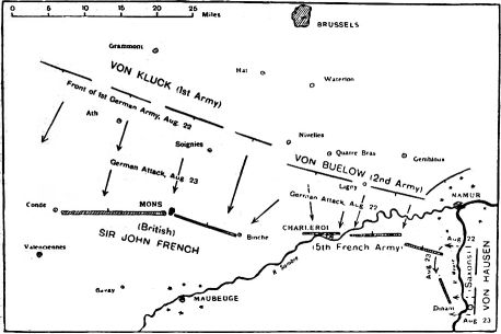 Meanwhile another fierce fight was going on farther east along the line of the Meuse. On Saturday morning a German army, which had advanced through the Northern Ardennes, crossed the Meuse into the angle between that river and the Sambre, where, you will remember, the Germans had already gained a footing. This new force attacked the right flank of the French, and began to work round to their rear, so as to threaten the line of retreat. With von Buelow pressing hard on the front, and the Saxon army pressing on the right and rear, the French in the angle between the rivers were forced to give way, and in order to save themselves from destruction were obliged to retire to the south. So rapid and confused was this retreat that the French staff neglected to send news of the disaster to Sir John French until the afternoon of next day. He thought that the French line was still holding out on his right; but as a matter of fact he was without any support in that direction, and was left, as the soldiers say, "in the air." Further, von Buelow was now able to spare some of his right-wing troops and send them to help von Kluck, who was about to swoop down on the British line.