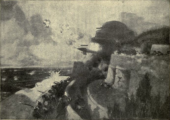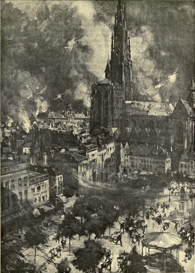 Next morning, 22nd August, five thousand French troops, mostly Turcos, arrived from the west, but they were too late and too few to save the fortress. It was a black, dread day for the Allies. The skies were darkened by an eclipse of the sun, and the people of Namur were in a state of panic. German aeroplanes flew over the place and dropped bombs, which killed many of the inhabitants and fired their houses. The heavens thundered, the great guns roared, and Namur fell.