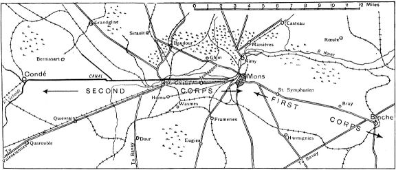 Sir John French assembled his commanders at six in the morning on August 23, and explained to them what he understood to be General Joffre's plan. He knew nothing of what had happened on his right, and he believed that one, or at most two, of the enemy's army corps, with perhaps one cavalry division, were on his front. He had no idea that the enemy outnumbered him by at least two to one, and that they were attempting to envelop him by attacking his exposed flanks.