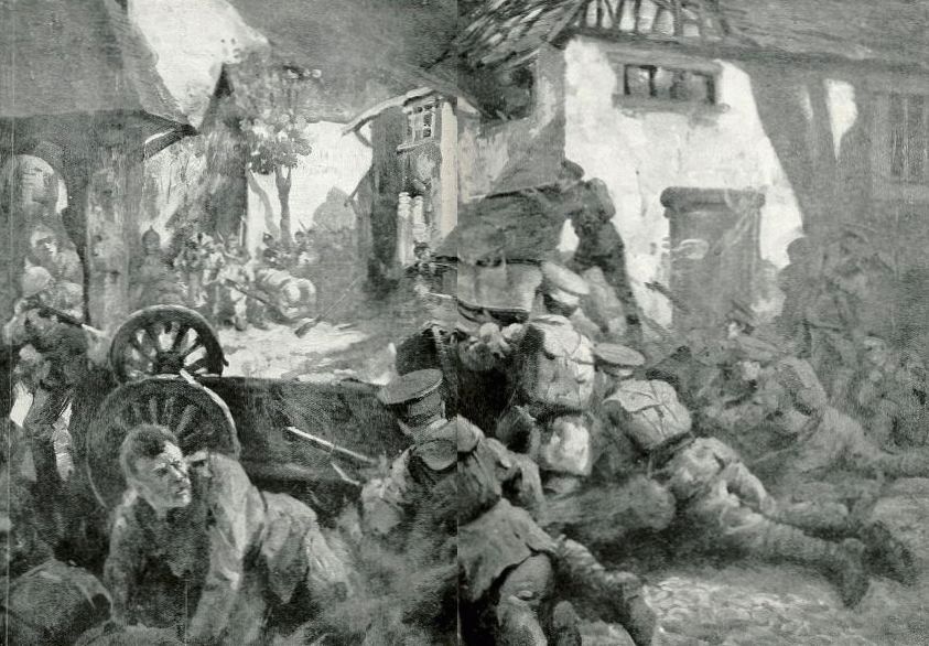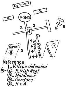 A private in the 1st Royal West Kent Regiment tells us how the battle began. He says: "It was Sunday, 23rd August, that we were at Mons, billeted in a farmyard, and we were having a sing-song, and watching [27] the people coming home from church. At about 12.30 an orderly had gone down to draw dinners when an aeroplane appeared overhead, throwing out some black powder. After this shrapnel began to burst, acquainting us with the fact that the Germans were in the vicinity. All was confusion and uproar for the moment, because we were not armed, and our shirts and socks were out to wash, that being the only chance we had to get them washed. It did not take us long, however, to get in fighting trim and go through the town of Mons to the scene of operations, which was on the other side of a small canal that adjoined."