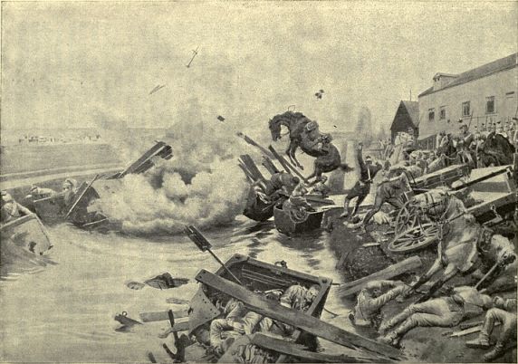 Meanwhile two of the eastern forts had fallen. Upon the fort just to the south of the Meuse the Germans guns rained shells at the rate of twenty a minute, and it was only able to fire ten shots in reply. The shells wrecked concrete and turrets alike, and nothing could resist them. The fort directly to the north of the river held out longer; but when seventy-five of its garrison had been slain, it too was forced to yield. At the same time the southern line of forts was fiercely bombarded, and after an attack of two hours three of them were silenced, and a German force was pushed across the Meuse into the southern part of the angle between that river and the Sambre. All day long an infantry battle raged, and the Belgians hoped against hope that the French would come to their assistance.