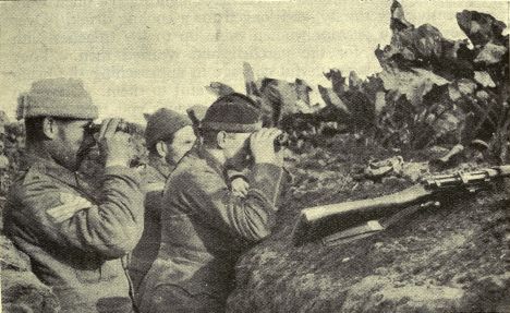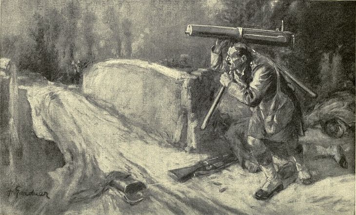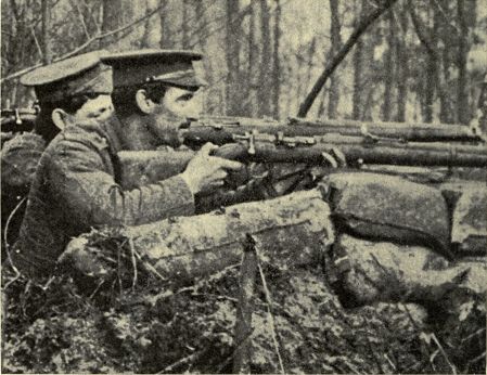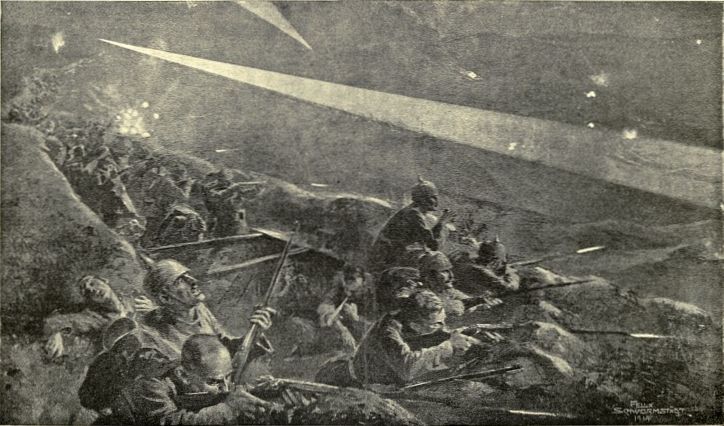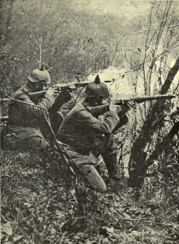 Our officers knew full well that the roar of the guns was the signal for the German infantry to advance. For a time nothing could be seen of them, for they took cover well, and their bluish gray uniforms seemed to melt into the leafy background. Our officers, who were eagerly scanning the landscape with field-glasses, only saw them when they began to open fire with rifles and machine guns.